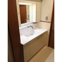 元々洗面ボウルだけの取り替えを希望されていたが思い切って下台全ての取り替えを提案。壁にキッチンパネルを貼ることで、デザイン・清掃面・使い勝手等において大変喜んでいただけました。