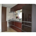 お部屋との調和を考えて木目調のデザインのキッチンをご提案させて頂きました。目の前の高さに手動で下せる吊戸棚を採用。使用頻度の高い調味料や乾物を入れておけるので、キッチンを収納の面からもすっきり見せてくれます。また内装工事により壁も美しく仕上げました。