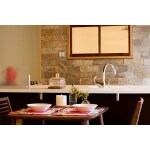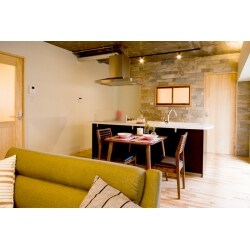 無垢材や石材など素材の組み合わせにこだわったLDK。灯り採り窓で風通しにも配慮 水廻りを移動したので床は10cmほどアップ。ダイニング側の天井は低かったので取り払い、構造体を剥き出しにすることで25cmほど上げています。梁は大丈夫だったのですが、天井の構造体部分は少し凹凸していたので、モルタルを薄く塗り、光沢のある塗装で仕上げています。それに合わせて、壁面に外壁でも使える石材を使って存在感を出しました。間接照明の灯りで陰影が浮かび上がるのもポイントです。また、寝室にアンティークのサッシを使って灯り採り窓をつくることで、風通しにも配慮しています。