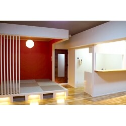古びたイメージの和室スペースはあえて残し、ダウンライトと赤い壁紙で個性的でモダンな空間に一変。フローリング部より一段高くなったことで腰掛けられるようになり、壁と襖を取り払うことで、家族や友人が顔を合わせながらいつでも気軽にくつろげる空間になりました。