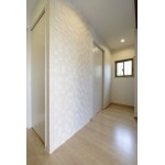 モノが溢れることがない様に洗面横のトール収納を採用しいつもスッキリするように収納力を高めました。 全ての部屋の壁・天井クロスが白系色だったためクッションフロアはアクセントになるデザインを選択いたしました。