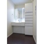 洗面横のトール収納でモノが溢れることがなくスッキリしています。 クッションフロアはアクセントになるデザインを選択いたしました。