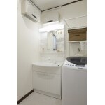 ドラム式洗濯機の大きさに合わせ、現在の洗面化粧台と同じ幅の洗面化粧台をご希望。 洗面室を清潔感が感じられるような提案をして欲しい。