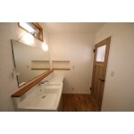 (旧株式会社ウイングでの事例です。)1階の手洗は帰ったらすぐ手が洗えるように、玄関内に設置しました。 2階の洗面化粧台は、既製品の洗面台に合わせて造作で棚を作りました。