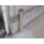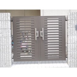 門塀の後ろに、門柱を建て、アルミ製に交換です。取っ手も押すだけで開くタイプにしました。