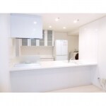 既設の間取りではI型対面キッチンにすると間口の狭い物しか置けないため、通路の分だけ廊下を一部潰しLDKを広げました。 天井・壁・床・キッチンすべて白色で仕上げることで、明るい空間を作りました。