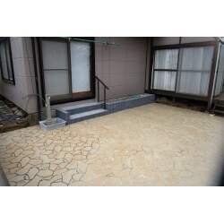 モルタル打設後にタイルや石を貼るのではなく、ステンシルコンクリートに模様をつけることで石を貼ったようなおしゃれな雰囲気に、安く仕上げました。