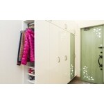 高さと幅を確保した玄関収納をご提案。圧迫感のない白い面材。鏡面仕上げで光を反射し、より明るく感じます。