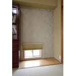 和ダンスは家事室兼納戸に移動し、パソコンはLDのキュビオスに収納できるようになり、畳や壁紙、天井、建具を一新。壁紙は一部に箔加工を施した意匠性の高いデザインを、天井には網代調のデザインを配し、モダンで高級感のある雰囲気に仕上げた。窓には、不透明生地とシースルー生地の切替えで採光が調節できる若草色のプリーツスクリーンを採用した。