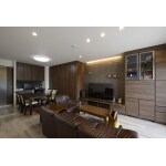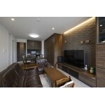 家族が集まる空間となっていた4.5帖の和室をLDに取り込み、バルコニー側からの採光と眺望を生かした明るく広々とした空間を誕生させた。ダイニング側の壁面には、枕棚や可動棚も備えた天井高のクローゼットを設置し、ダイナミックな収納力を装備した。カウンターを設置したもう一方の壁面にはワインセラーを置き、ワイングラスホルダーも備え、レザー風の壁紙をアクセントに用いてスタイリッシュなホームバー仕様に。リビング側のテレビ置き場の壁面には、調湿作用があり、臭いや有害物質を低減させるインテリア壁材「エコカラット」を採用。土の質感を生かしたタイルと間接照明が高級感を添え、リビング収納「キュビオス」とともにダークブラウン系のカラーで統一することにより、落ち着きのあるシックな雰囲気を演出。大型テレビと既存のレザーソファを据えてホームシアターとしても機能する贅沢な空間となった。リビング側の照明はダウンライトに変え、フロア材にホワイト系のカラーを採用することで、重厚になり過ぎずすっきりとした印象に仕上げた。