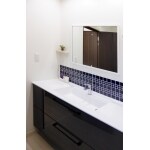 洗面化粧台は弊社おすすめのTOTO製エスクアです。 レイアウトに自由度があり、洗練された雰囲気を演出できます。 鏡の下部にはキッチンに施工した飾りタイルと同じ物をチョイス。引き出しのパネルも同系色に統一し、住まい全体に一体感を出しました。