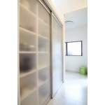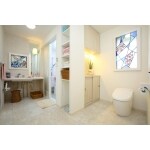 構造的に主要な柱や耐力壁は残し、既存の窓からの光が室内に有効に届くようなレイアウトにしました。ご夫婦のライフスタイルから、洗面脱衣室を広く取りその一部にトイレを配置しました。奥様とご主人が共同で造られたステンドグラスを窓にはめ、ギャラリーのようなユーティリティが完成しました。