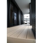 屋根のあるインナーバルコニー・ウッドデッキを大きめに幅を取りました。リビングからすぐに外に出入りできます。