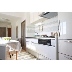 キッチンは白色をご希望でまた壁に白とグレーのタイルをご希望だったので各メーカーよりサンプルを取寄せお客様と一緒に選ばせていただきました。タイルの色の配置はこちらから提案させていただき、2色をバランスよく配置できたかと思います。