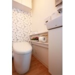 トイレはお客様のご要望のライトがありましたが、天井の高さから頭にあたってしまう恐れがあるなどから断念させていただいたので、少しでもお客様のご要望に近いものをこちらで選ばせていただきました。 トイレの紙巻器は、以前よりお客様が取付けたくてお持ちの物を今回の工事で取付けさせていただきました。お持ちの物をご利用いただくことができ良かったと思います。 トイレの壁紙はお客様のご要望があり最終的にはお施主様に選んでいただきました。