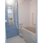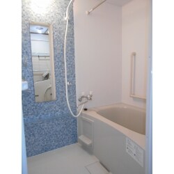 リフォーム後の浴室。 手摺り等もつき、快適に過ごせるようになりました。お客様お気に入りのブルーのタイルのアクセント柄は標準の仕様にてお選びいただけます。