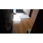 施工前の玄関の上り段付近の写真です。 お客様の方でクラフトテープで補強してありますが、廊下の浮き沈みは治まらず、まるでクッションの様な状態になっていました。 またフローリング表面には大小多数の傷が目立っています。