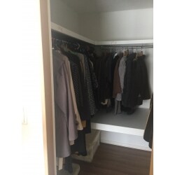 奥行の浅かった押入をウォークインクローゼットに改修しました。扉は一か所ですが、コノ字型に配置した枕棚の上に、普段あまり使用しないもの、枕棚下にはステンパイプを設置し、ハーフ丈の衣類をかけ、正面に設置した中棚の下には衣装ケースを置き、手前の方は、ロング丈のコートなどをかけることができるので、押入れにおききれなかった衣類も全て収納できました。