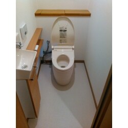 トイレをタンクレスの節水タイプに交換、手洗いカウンター設置、クロス・CF張替えを行いました。手洗いカウンターは給排水移設をせずに設置ができるタイプだったので短時間で設置が完了しました。