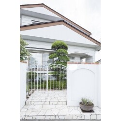 樹々の緑やカラフルなお花が際立つよう、白を基調としたパースでプランニングします。白い塀に白いアイアン製のクラシカルな門扉とフェンスをコーディネート。塀には素焼きのレンガを積んで温かさをプラスします。アプローチは水はけなどの機能性や、視覚的デザインに配慮しながら、整形・配置していきます。