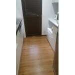 キッチンの床にはガラスコートを行い、汚れが付着しても沈着せずキレイを保持できるようになった。 尚、収納力も充実しており、引き出し収納と足元収納でキッチン用品もすっきり片付きました。
