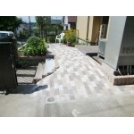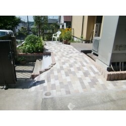 エスビック社のロッキング仕様によるポーチを紹介 ・駐車場側からは なだらかな勾配として工事 ・道路側からはもなだらかな勾配字と旧階段も残して併存させる 1)インターロッキング工事 ・職人と相談して見栄えのよい配列に構成し お客様に提案しました。 尚それ以外にも工事はありますが省略します。 2)庭までの工事 ・飛び石の転用と周りに化粧石を敷く仕様を提案