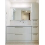 TOTO オクターブW1200+W300サイド収納にお取替え。 扉色はパナシェホワイト、カウンターはホワイトをお選びいただきました。 収納も備えたスウィング三面鏡は左右どちらからでも開閉できます。また左右の鏡を手前に引き出して手元鏡として使うこともできます。