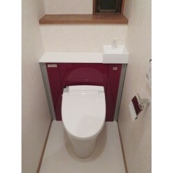 LIXILリフォレI型手洗い付にお取替え。 キャビネットのお色はカームレッドという落ち着いた赤色です。 トイレと合わせて天井・壁のクロス貼替え、床のクッションフロア貼も合わせて行い、全体的に明るい印象へと変わりました。