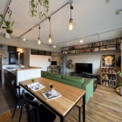 無垢材を使った床や、コンクリート打ちっ放しの壁、ブリックタイルを使うなど、デザインには具体的なイメージがあった。 プランは、ふたり暮らしなので部屋数は必要なく、寝室とLDK、あとは土間や収納…というイメージ。 持ち物としては靴が多く、帽子、鞄などおしゃれなものがたくさん。 玄関を土間にし、通勤で使用している自転車を置いたり、休日はメンテナンスやカスタマイズをして楽しむ…というアイデアもあった。 以前の住まいは浴室が小さく、手足を伸ばして入ることができなかったので大きなバスルームがほしかった。