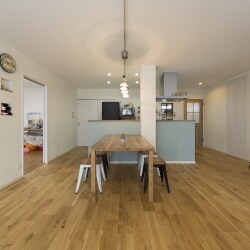 LDKを建物の中心に配置し、左右にそれぞれの居室を設けました。 10年後お子様が中学生になっても、出かけるとき・帰ってくるとき・お風呂に行くとき・トイレに行くとき。 すべてリビングにいるご夫婦と顔を合わせることができます。 広く、明りがたくさん入るLDKにこだわり、対面キッチンにすることで料理をしながらでも、リビングの家族と会話が出来る空間作りにしました。