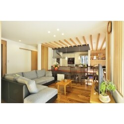 ご夫婦とペットのワンちゃんが、末長く楽しく暮らせる「終の棲家」をテーマとしました。お酒が好きなご主人とお料理好きの奥様お二人ともが楽しめるダイニングバーをイメージ。ダイニングにもなる長いカウンターを設けた対面キッチンは暮らしの中心となるスペース。お料理中もお客様と会話が途切れることはありません。要所要所に設けた収納で片付けもラクに済ませられます。書斎とはしませんでしたが日当たりの良い和室はご主人お気に入りの場所。耐震、断熱、遮音、調湿、省エネと住宅ストック支援事業補助金の規定に適合する安全性、快適性をアップした住まいはバリアフリーで末長く快適に暮らしていただけます。