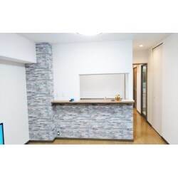 写真では分かりにくいですが、リビングはレンガ調のクロスを二カ所で使っています。 キッチン開口奥のクロスが白色でレンガ調になっております。 キッチンには、パナソニックのラクシーナ。 スライド収納でゆっくり閉まるオプションもついております。 シンクの手前三角の部分には、電気コンセントもついています。 トイレの床材はフロアタイルなので、つるつる仕様です! 完成後は大満足して頂きました。