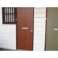 木目調のベニアを張替えました。古いアパートの玄関扉ですが、こういったプチリフォームも弊社は対応させていただきます。