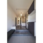 石目調の床を採用し、高級感を演出しています。 ホワイトとブラックの色を使い分けて空間にメリハリをつけ、天井を可能な限り高くすることで、開放的で明るい印象になりました。 土間につながる部分には、一緒にお住まいであるおばあ様が楽な姿勢で靴が履けるようにベンチを設置しました。 身体になるべく負担がかからないように…と施主様の願いが込められています。