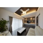 平屋のため中央部分のみ天井を上げ、アクセントクロスを貼ることで一層広がりを感じる開放的な空間へ変わりました。 さらに天井には間接照明を設置し、上質な雰囲気に仕上がりました。 テレビカウンターは人造大理石で造作し、モダンな雰囲気が出るようにガラスの棚やステンレスのカーテンレールを採用するなど、隅々までご提案しました。
