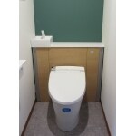 節水型でタンク式トイレを採用し、棚部分の上に手洗いを備え、かつちょっとした飾り棚としても使えるようになりました。また棚の側面をキッチンと合わせました。