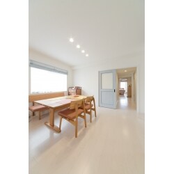 4LDKから3LDKへと部屋数を減らしてのリノベーションはリビングとダイニングを仕切る扉は上吊り扉をを採用して、下レールをなくすことでリビングダイニングを地続きに。 生活スタイルやシーンに合わせてお部屋の形を変えられます。