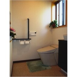手洗い付きの便器をタンクレス便器と手洗いキャビネットに別けるご提案をいたしました。 カウンター付き手摺りと壁にニッチを設けて小物をのせる飾り棚を配置するご提案をいたしました。