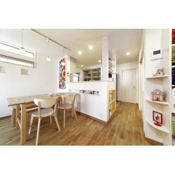 (旧株式会社ハウスドゥでの事例です。)料理をしながら、遊んだり勉強しているお子様がどこにいるか見渡せる間取りにしたいことや、お子様が学校でつくった工作などを飾りたいという要望から、対面キッチンや壁面収納やニッチなどをご提案しました。 また身体のことも考慮し、無垢材や珪藻土などの身体に優しい自然素材を使用し、快適な生活を過ごしていただけるようにしました。