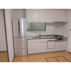 収納等を考慮して、システムキッチンにして冷蔵庫のスペースを確保し、部屋を広く使えるようにしました。