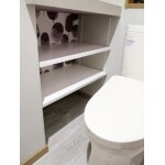 カウンター下のデッドスペースの奥行を半分くらい残して埋めました。物が取り出しやすいよう給水を床からにし、背面のカウンターも解体。その分、トイレを奥に設置し、棚付の紙巻器や手摺、手洗いをつけても圧迫感が出ないようにしました。
