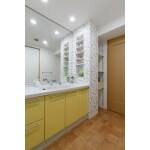 奥様がお好きなブルーの花柄のクロスをあしらう事で更に黄色が映えるポップな空間をなり、収納量も増え、散らかりがちな洗面がスッキリとした印象に。