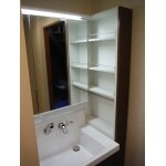 浴室の壁と同じダークブラウンの扉でコーディネートした化粧台は3面鏡を採用。少し狭くなった洗面所を広く見せる効果もあります。収納もスライドタイプで取り出しも簡単になり、サイドには収納棚も設置。日頃よく使う化粧小物はこちらに置いていただくと便利です。