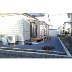 雑草の手入れにお困りでしたので、防草シートと砕石により敷地全体を低価格でメンテナンスの必要がないようご提案致しました。テラスはサイクルポートを使用する事で建物に固定することなく屋根への設置が可能に。また、駐車スペースはインターロッキングと花壇でおしゃれに変身しました。