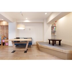 元押入れだったスペースを小上がりに変更。畳下は収納スペースにもベンチにもなる。デッドスペースには本棚を新設し、読書をしたり、寝転んだり…わずかなスペースながら大きな梁が「おこもり感」をつくりみんなが安らげる空間になりました。