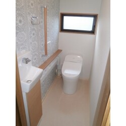 タンクレストイレへ取替。ご高齢のご家族の足腰への負担を軽減できるよう手すりの取付をご提案。手洗器もトイレ入り口へ設置する事で、小さなお子様からご高齢のご家族まで、手洗いしやすくなりました。クロスもいろいろな種類の中からお選びいただけます。