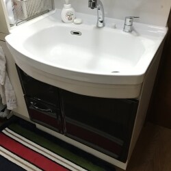 洗面化粧台をすぐに取替て欲しいとのことでしたので、迅速にご対応させていただきました。 洗面ボウルからのひび割れが原因で水漏れしてきておりましたので、耐久性もあり、傷がつきにくいホーローの洗面化粧台をご提案させていただきました。