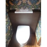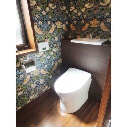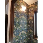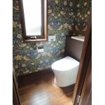 TOTO レストパルI型手洗器付きにお取替え。 キャビネット・天板はダルブラウンというこげ茶のお色で落ち着いた上品な印象に。 クロスはウィリアム・モリスの「いちご泥棒」Strawberry Thiefという名前の輸入クロスです。 いちご泥棒のデザインは、園芸家たちの日常の暮らしの中にある小さな悩みからインスピレーションを得て作成された非常に人気の柄です。 何色か色のバリエーションがありますが、今回はブルーをお選び頂きました。 今回は壁4面全てにこちらのクロスを施工しています。