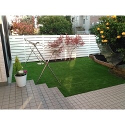 生垣を取ってしまうと道路より敷地内が丸見えなので目隠しフェンスをご提案し、床部分も手入れのかからない人工芝を一緒に施工しました。
