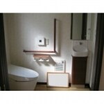 和室を車いす対応フローリングの寝室に改修。 間仕切り壁を撤去しトイレと繋げました。 車いすでも行き来できるよう広い間口がとれる2連吊り戸にし、タンクレストイレと手洗いをコーナー型にすることで、余裕のある空間を確保しました。